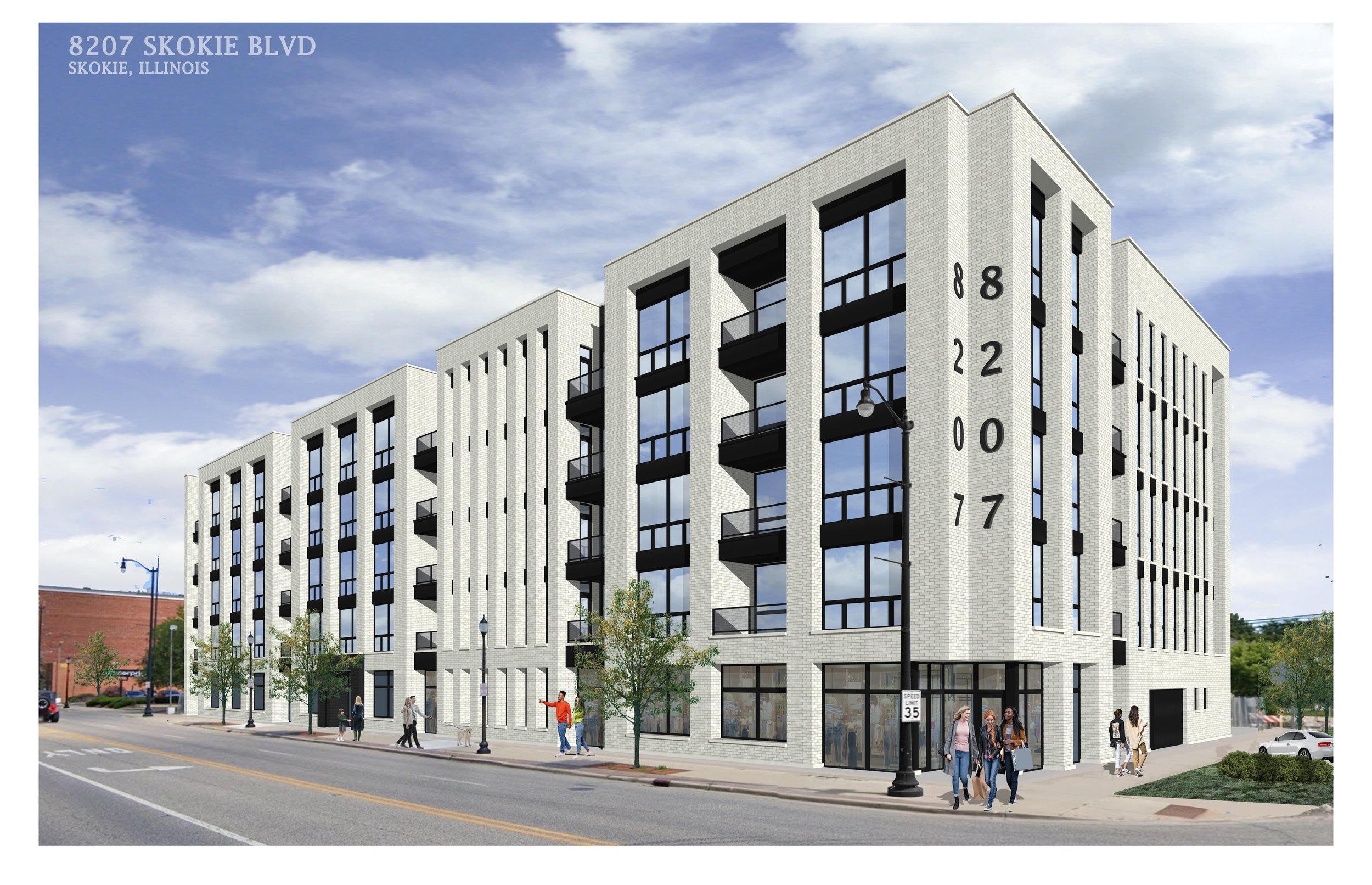 Modern luxury mid-rise, new construction building. Building features fitness center, onsite parking garage, package receiving area, and panoramic furnished rooftop deck with grills near United Center.