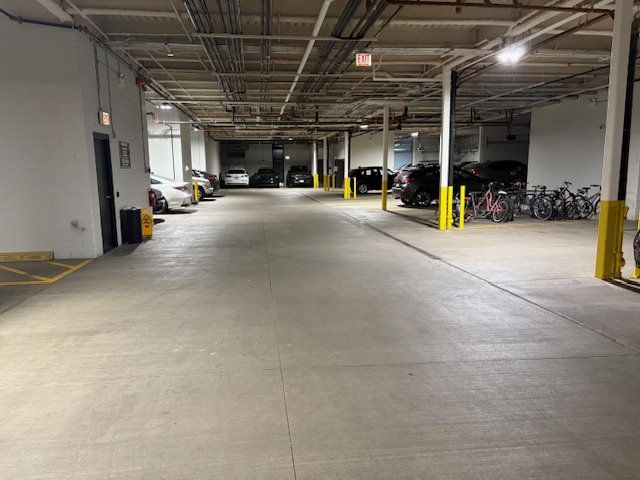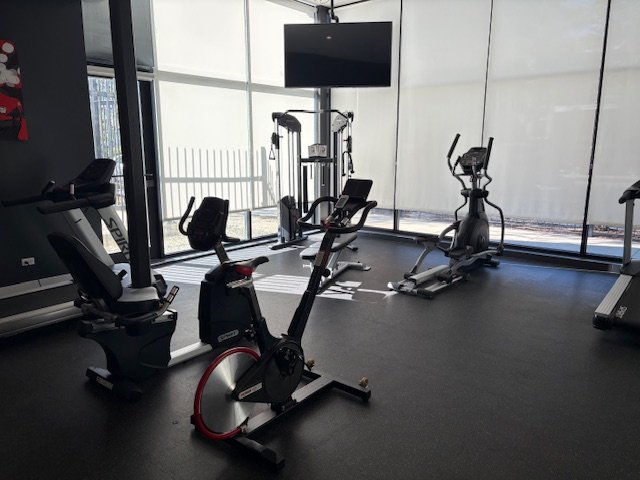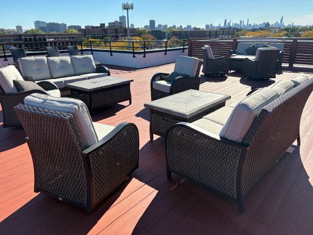 Mid-rise apartment building delivering condo-quality one and two-bedroom units featuring high ceilings, open-concept kitchens with high-end appliances, custom stone bathrooms, and in-unit laundry. Building showcases full fitness facility, parking garage, and stunning 360-degree panoramic rooftop deck with grills and lounge furniture.